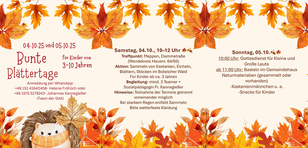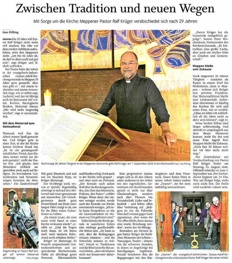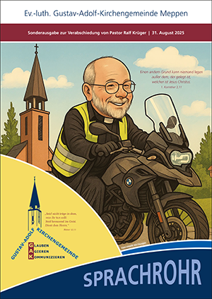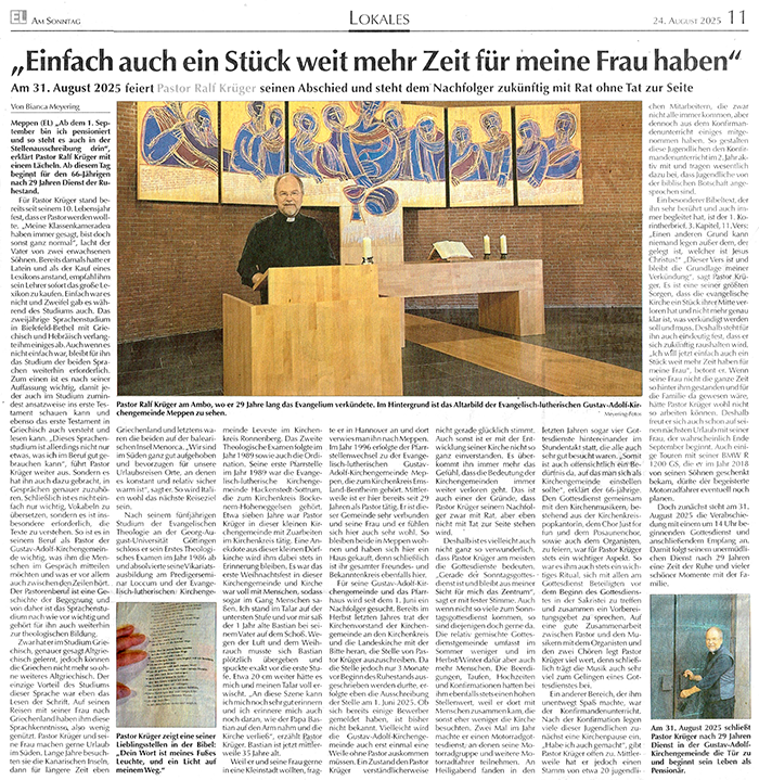 Der Terminkalender öffnet sich im Wochenformat. Hier finden Sie die Sonderausgabe des Sprachrohres zur Verabschiedung von Pastor Krüger Verabschiedung von Pastor Krüger am 31. August 2025Hier gelangen Sie zur Bildergalerie mit vielen Fotos und musikalischen Videos. EL-Kurier vom 23. August 2025 Meppener Tagespost vom 15. August 2025 Ev.-luth. Gustav-Adolf-Kirchengemeinde Meppen Zum 1. September 2025 wird die Pfarrstelle vakant Mit Klick auf die Stellenausschreibung finden Sie weitere Informationen. Meppener Tagespost vom 16. Juni 2025 EL-Kurier vom 14. Juni 2025 Enthüllung der Gedenktafel für Hans Ohlms † (Fenster) und Jo Klose (Altarbild)Pfingstsonntag, 8. Juni 2025